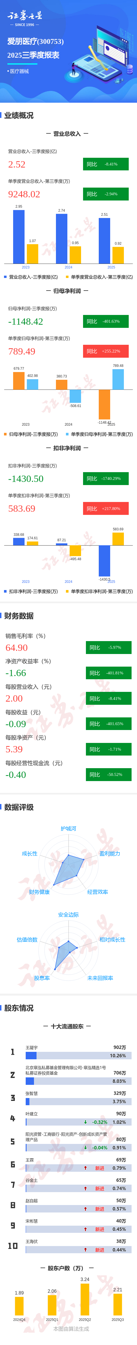 证券之星消息,爱朋医疗2025年三季报显示,公司主营收入2.52亿元,同比下降8.41%;归母净利润-1148.42万元,同比下降401.64%;扣非净利润-1430.5万元,同比下降1740.29%;其中2025年第三季度,公司单季度主营收入9248.02万元,同比下降2.95%;单季度归母净利润789.49万元,同比上升255.22%;单季度扣非净利润583.69万元,同比上升217.8%;负债率18.29%,投资收益143.08万元,财务费用178.07万元,毛利率64.9%。